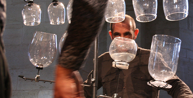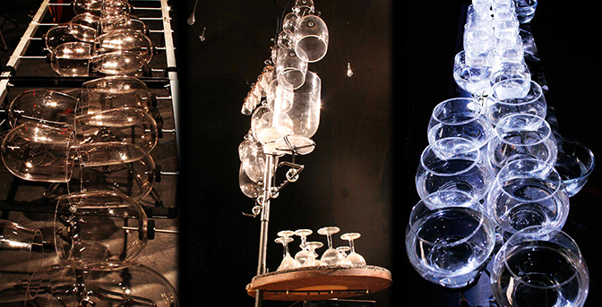 “L’Arbre à verre”, installation/instrument combinant le verre sous diverses formes (cloches, verres, pieds de verres, glass-chimes…), permet de mélanger différents sons et modes de jeu du verre.