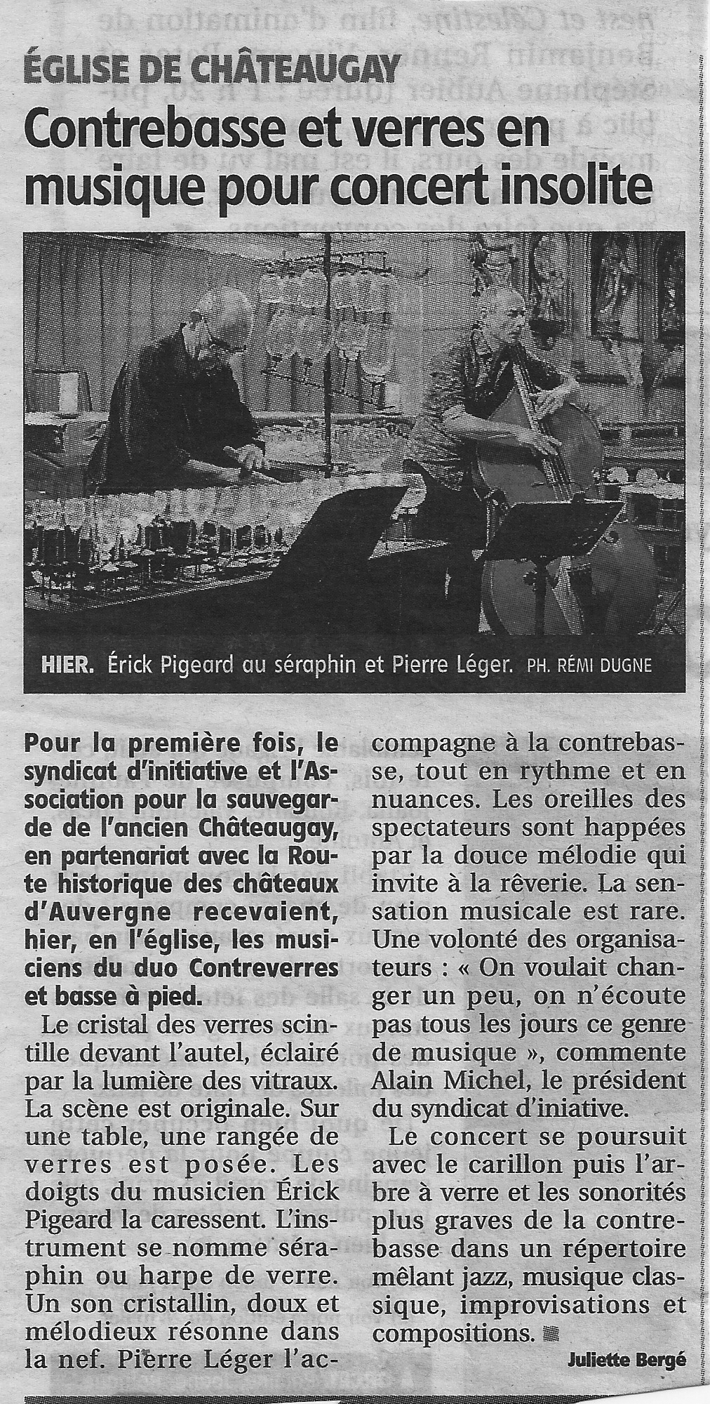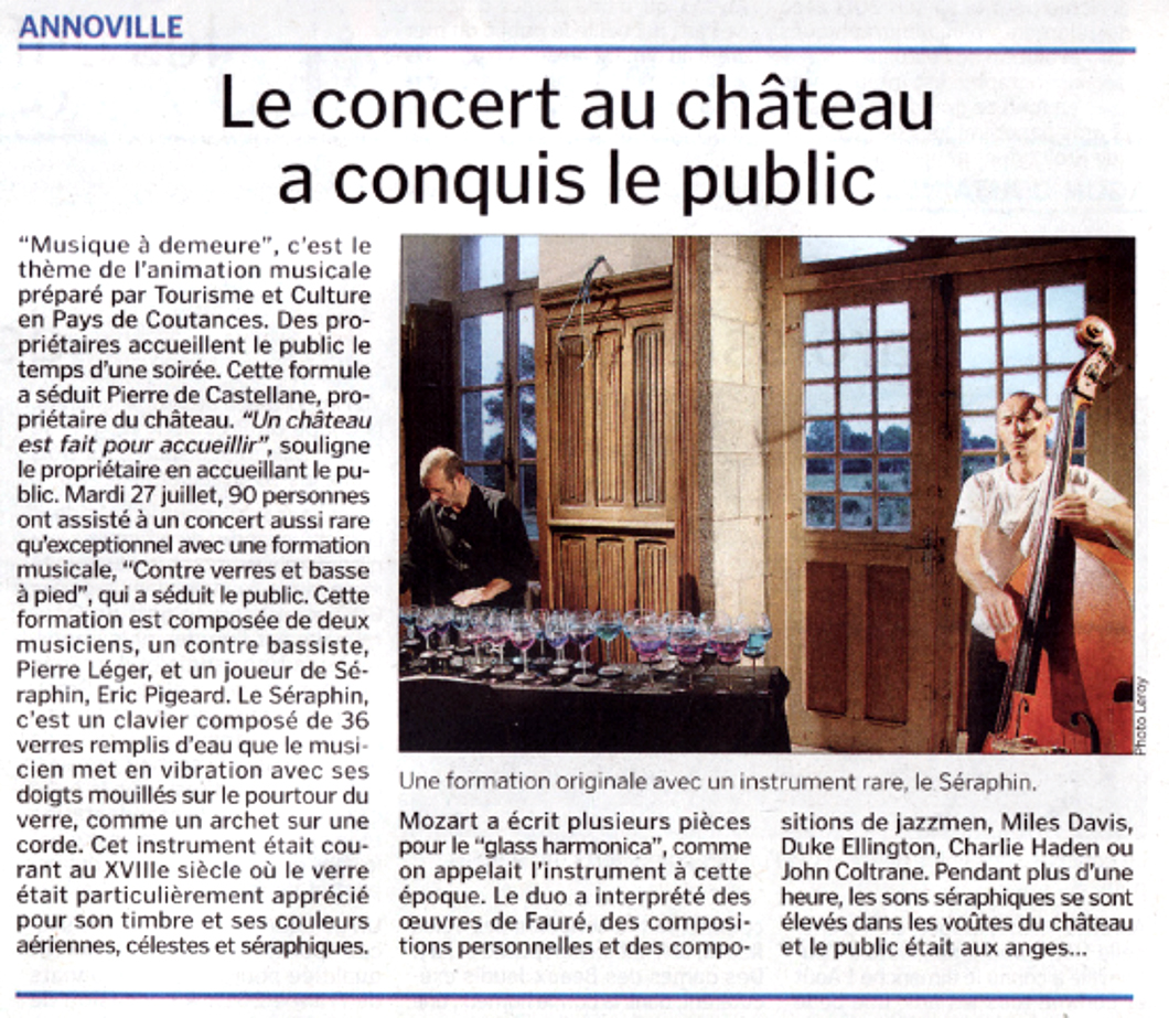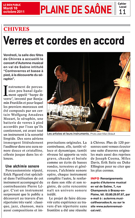 “ContreVerres & Basse à Pied”, duo instruments de verre/contrebasse, est né en 2006 à l‘occasion du festival “Des Moults des Notes”, manifestation réunissant les mondes de la musique et du vin.