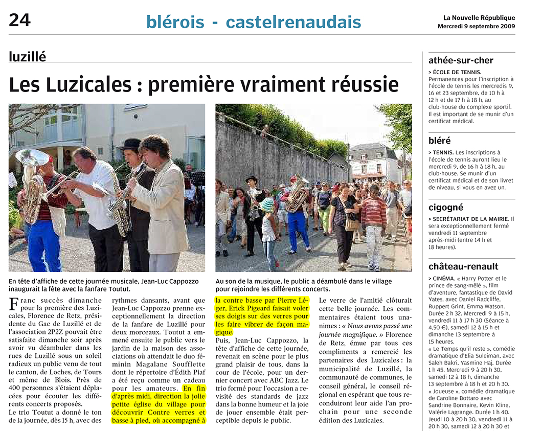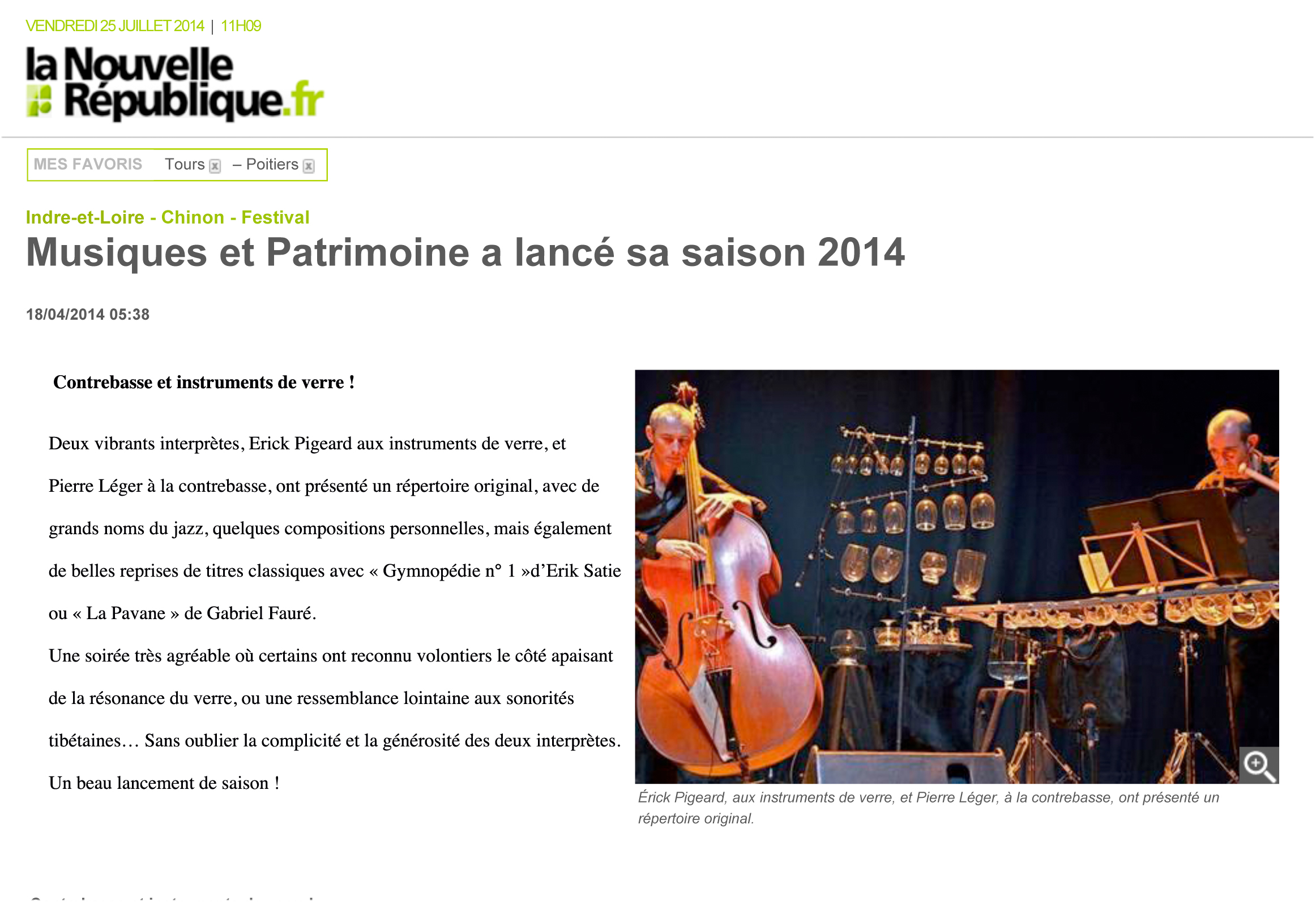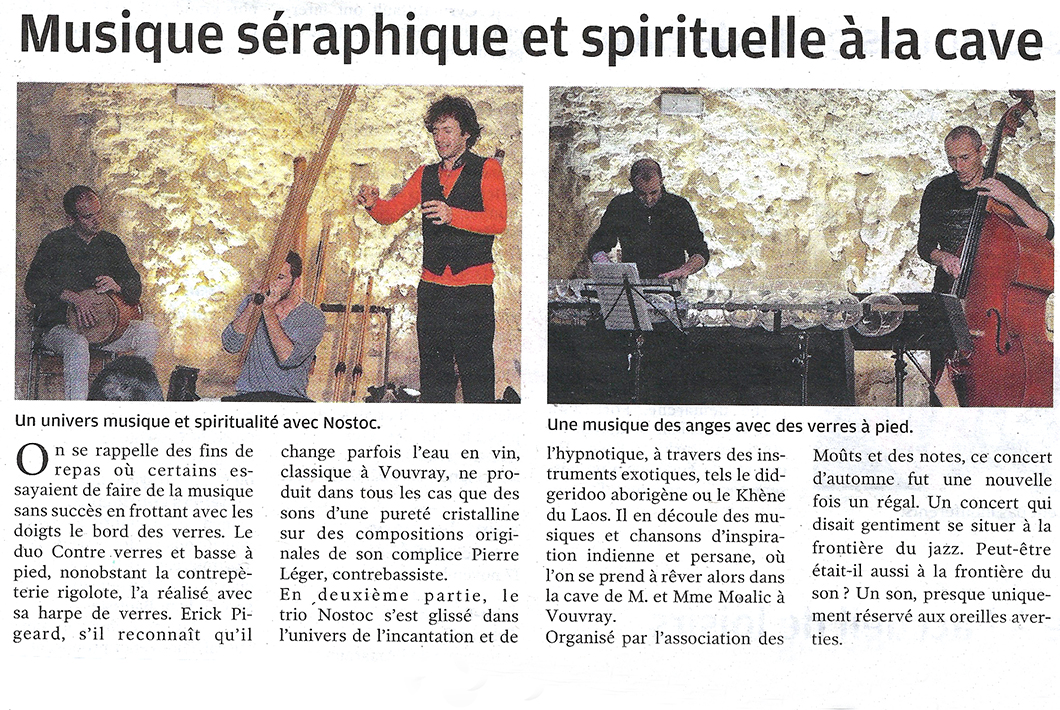 “Le Petit Faucheux” à Tours,”Ballade musicale” à Courcay, “Les Visites” concerts chez l’habitant à La Riche “La Pléiade”, Festival “Des Moûts et des Notes” à Noizay, “le Petit Théâtre des Balcons” à Ferrière Larçon, Festival “Chinon en Jazz”, “La Cité idéale” Abbaye de Fontevraud, La guingette “Tours sur Loire”, Festival de jazz “Notes à Belle à Isle”, “Livres en Vigne” au Château du Clos Vougeot, Les Luzicales à Luzillé, Festival “Musicalement vôtre” à Arques, Musée de la Tonnellerie à Chécy, “Les Musicales en Confluence” à Ballan Miré, “Vignerons Indépendants” à Cheverny, Festival “Val de jazz” à Sancerre, Festival “Musique à demeure” au Château d’Annoville, “Nacel” à Verneuil sur indre, Saison culturelle à Brienne le Château, Festival “Garçon la note”à Venoy, MJC de Aÿ, Festival “Automne musical en val de Saône” à Chivres, La Guinguette de Saint-Avertin, Ouverture de la saison culturelle à Amboise, Concert-performance à l'Abbaye de Noirlac, “Des Mouts et de Notes à Vouvray”, “Divines et sens” à Château Renault, Concert dégustation au Château de Selles sur Cher, La Route Historique des Châteaux d’Auvergne, Musique et Patrimoine (Chinon - Espace Rabelais).