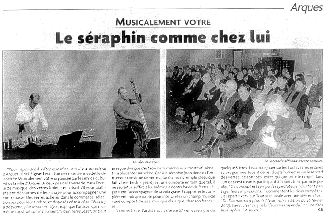 Le “Séraphin” est un instrument de verre frotté, également appelé “harpe de verre”. Son invention remonte au XVIIIe siècle. Elle est attribuée à un certain Richard Puckeridge, musicien irlandais, qui créa son “Orgue angélique”. Gluck, célèbre compositeur anglais s'en attribuait également l'invention…